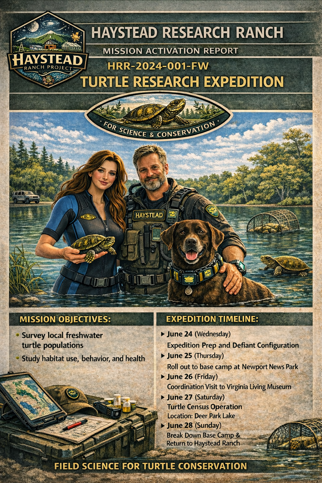 The Haystead Research Ranch team—Dr. Laura, David, and Scout (AKC Therapy & Science Ambassador K-9)—will participate in a multi-day field expedition in partnership with the Virginia Living Museum as part of their long-term freshwater turtle population study.