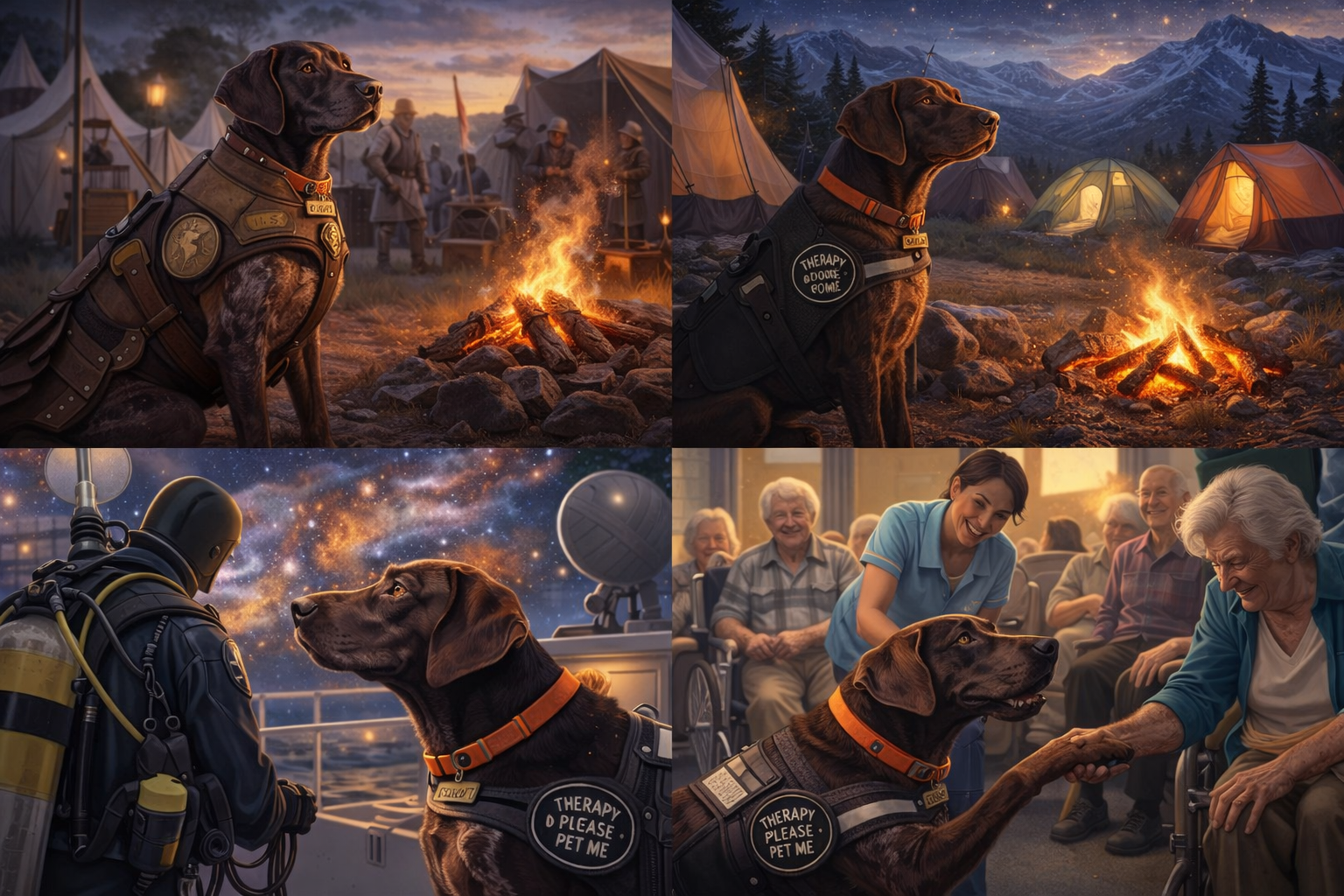 From quiet therapy visits and historical encampments to mountain-top campsites, research vessels, and observatory domes beneath the stars, Scout approaches every mission with curiosity, loyalty, and an unwavering belief that every new place contains a friend waiting to be met.