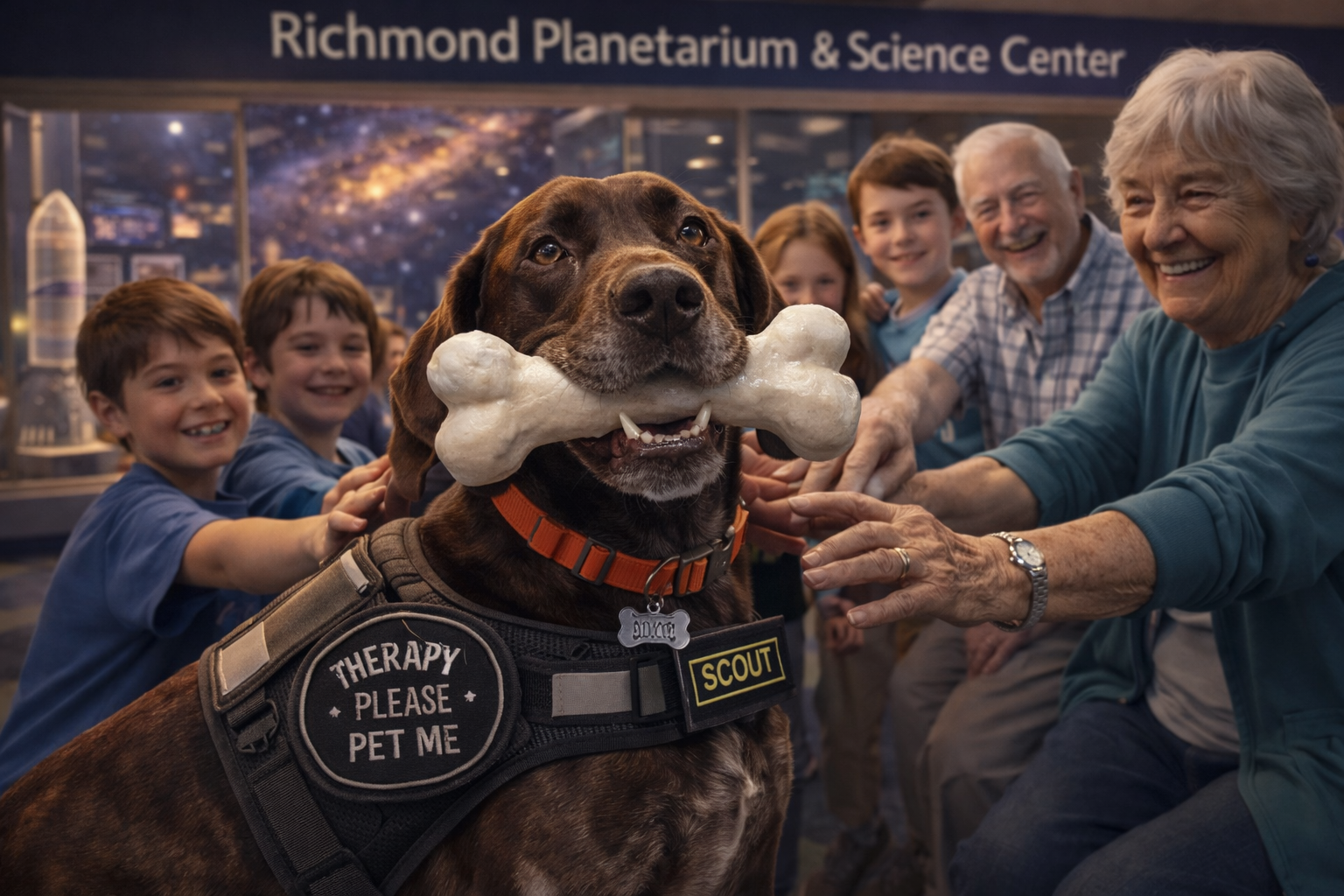 Her role extends beyond the ranch. As a certified outreach and therapy dog, Scout helps connect people—especially young students—to the excitement of science. Whether visiting educational programs, greeting families at science centers such as the Richmond Planetarium & Science Center, or accompanying field research activities, Scout reminds everyone that curiosity is the first step in discovery.